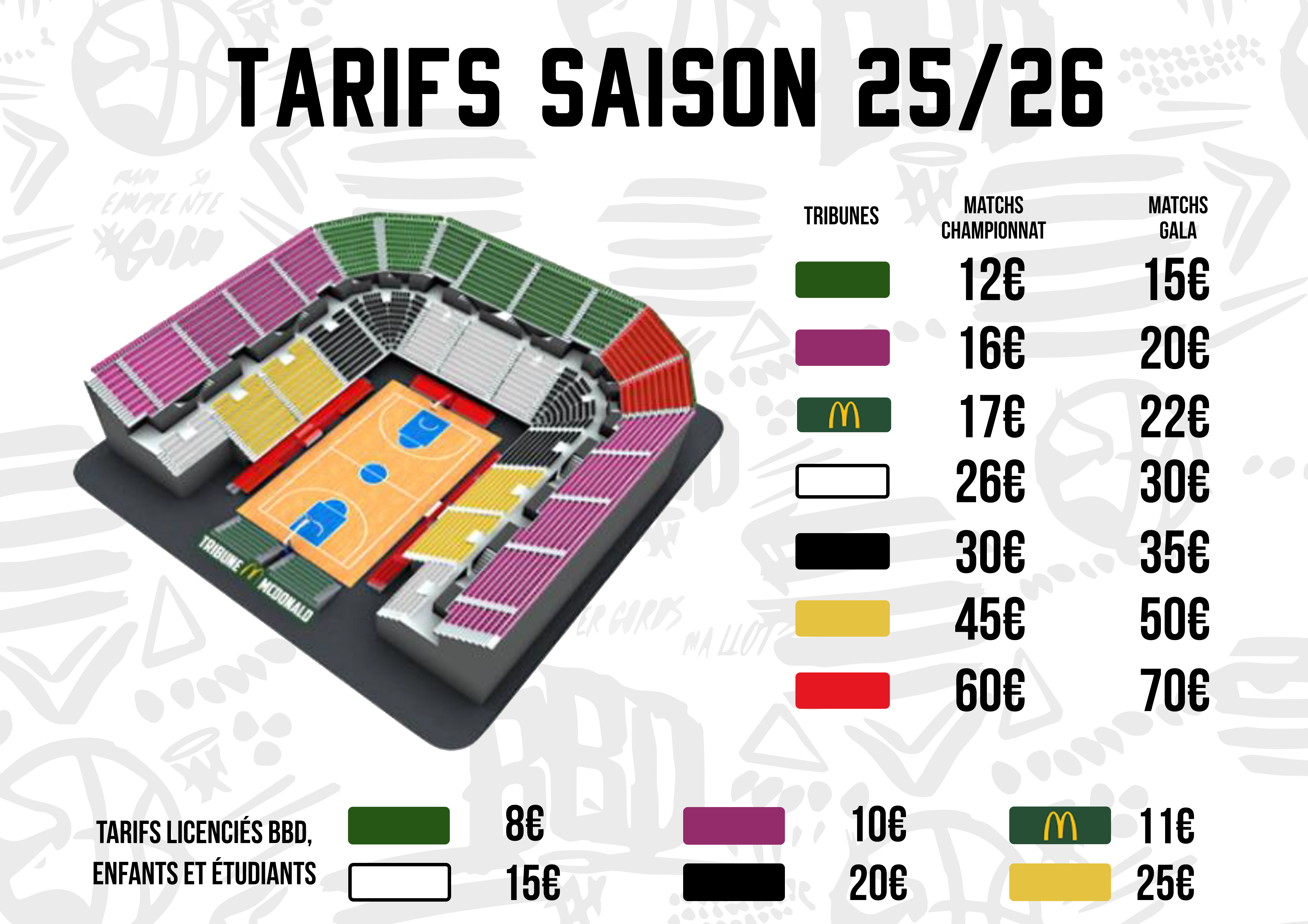 - Le nombre de places et le tarif (adulte, enfant, licencié basket, étudiant)
