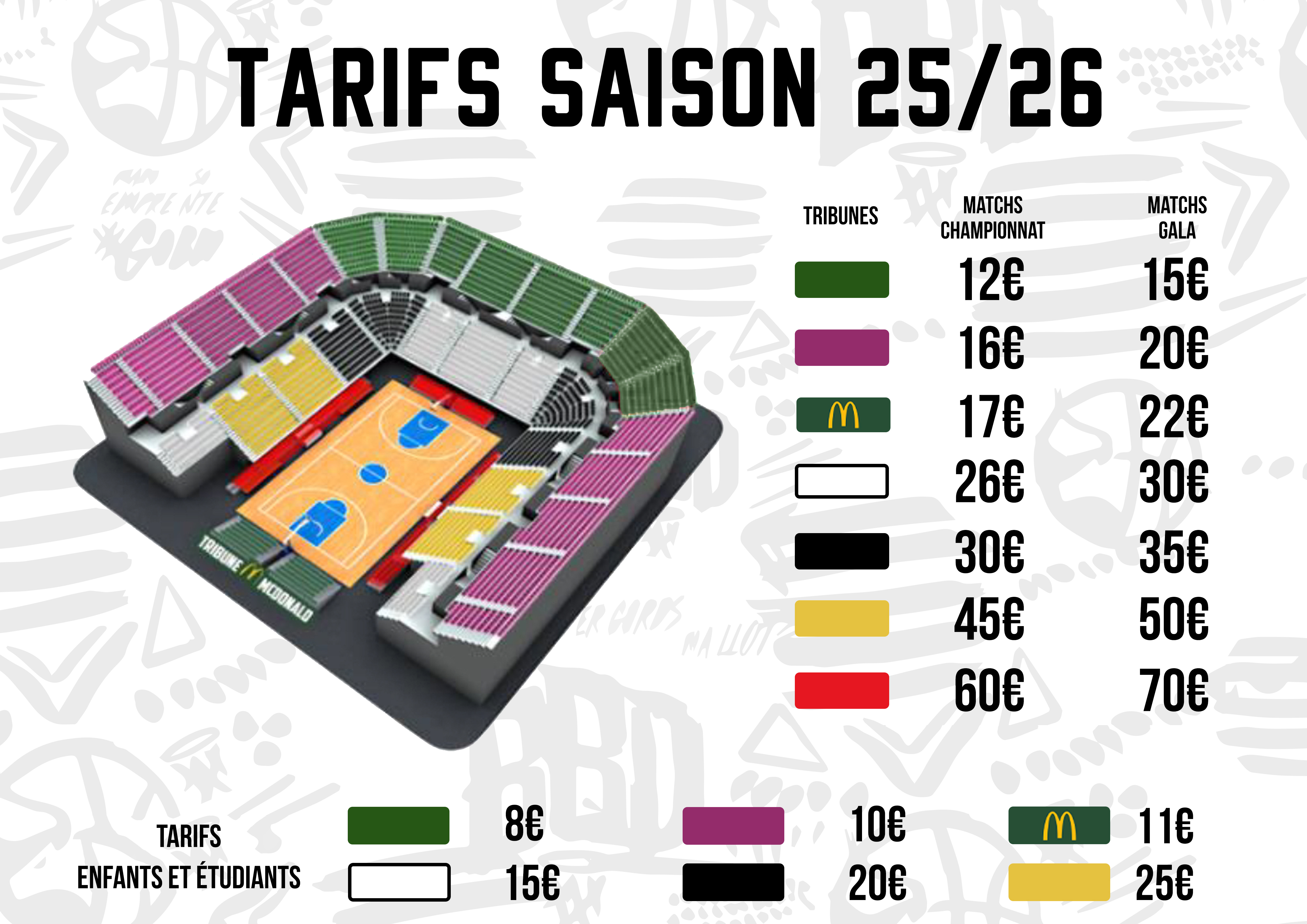 - Le nombre de places et le tarif (adulte, enfant, licencié basket, étudiant)